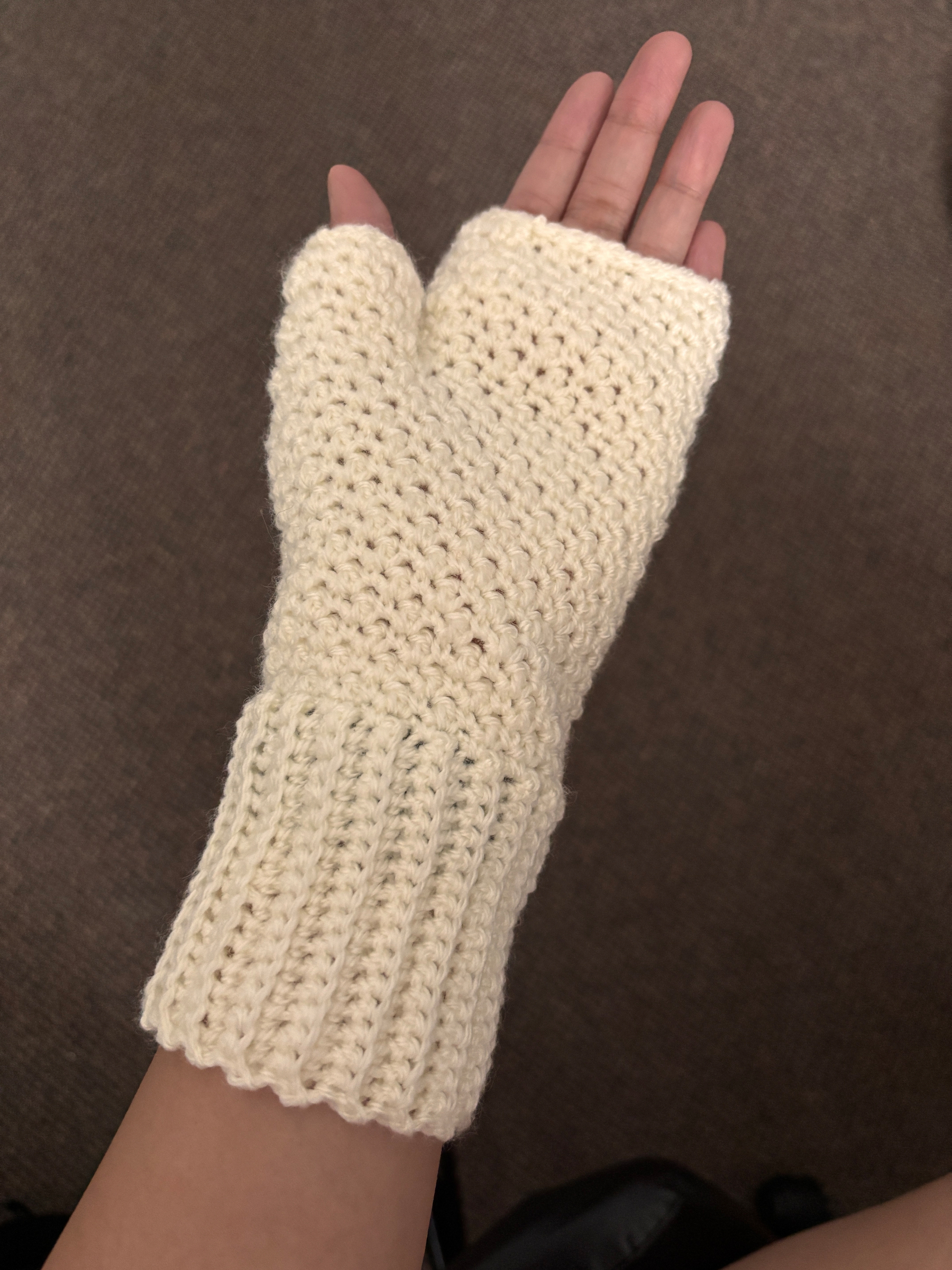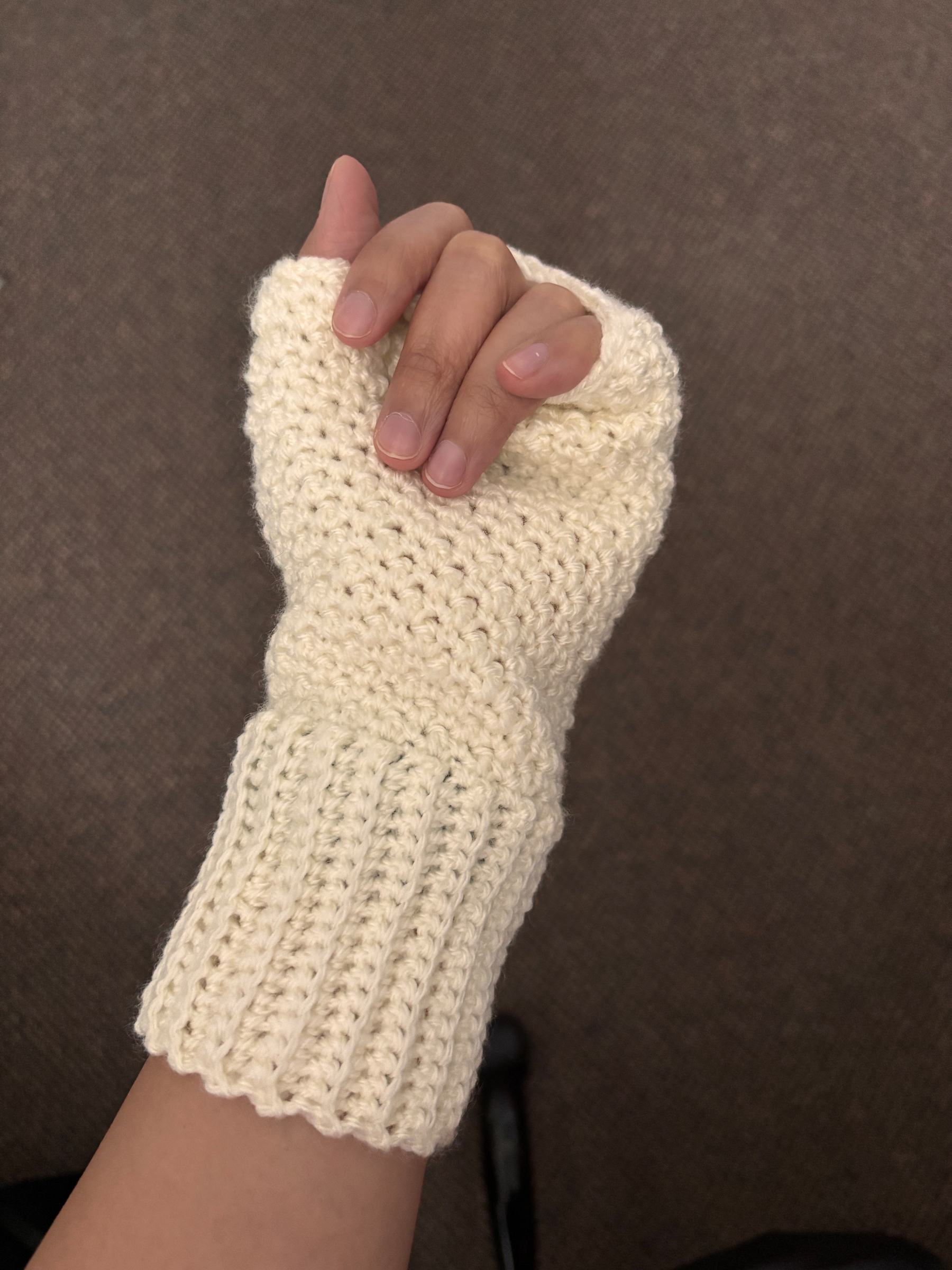 After I finished the beanie, I still had a lot of the cream colored yarn leftover. So I decided to start making fingerless gloves. Every time I’m on campus and I’m working on my laptop, my hands start getting too cold. I don’t want to wear gloves because I can’t feel the keyboard well. I think this will be an accessory that will be used often.